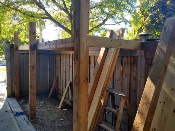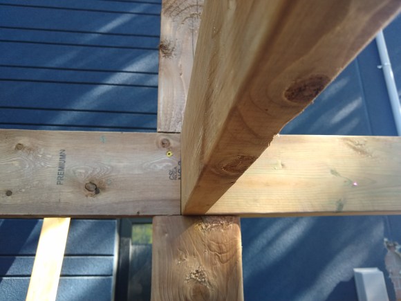 There is one more section to put in. Then I will put more posts halfway through each of the sections so that there’s about a 4′ spacing between the posts on the side opposite the fence. That’ll be next weekend’s work. If I get the joist hangers by then I’ll put those in as well and the main structure will be complete. Then it’ll be time for the roof.