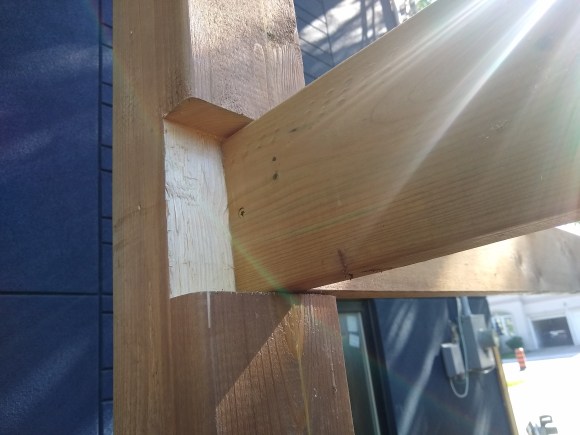 Here are the joist and two beams all fastened in place. I did some chin-ups on it and it isn’t going anywhere. Having the joist and beams go straight into the notch on this side would be significantly stronger than any joist hanger as basically the structural integrity of the post itself keeps them up.