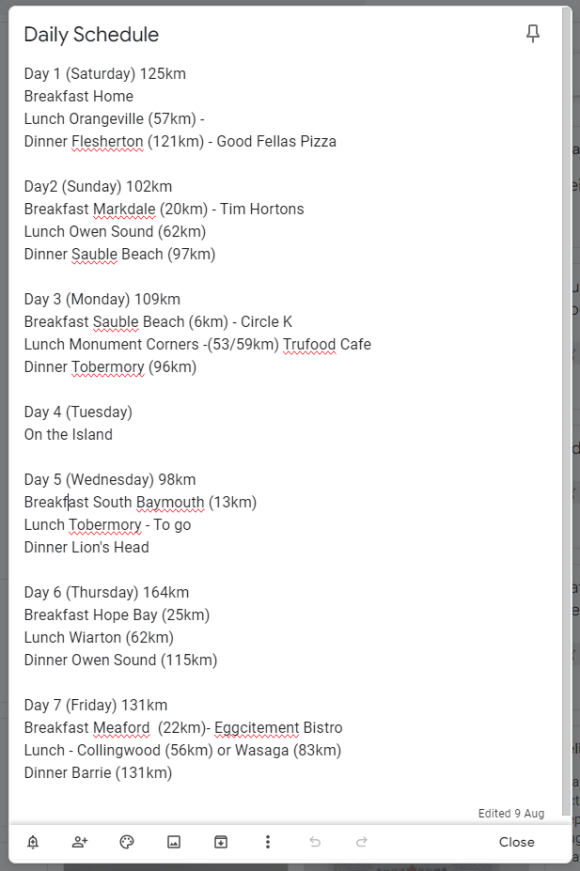 For the way back I knew that the last train from Barrie to Toronto left at 9:10 pm but there was also a bus that left at 11:00pm so there was no worry about getting to Barrie too late and being stuck there for the night. I ended up deciding to stay at a city campground in Lion’s Head for night 5 and then a private campground between Owen Sound and Meaford for night 6. With my start and end points for the days all worked out now I needed to fill in details for where I’d be getting my meals. In bigger places like Owen Sound or Tobermory there would be many available options but in smaller towns there may only be one or two, and sometimes I wouldn’t be near one when I wanted to have lunch for example, so using the route and Google Maps I then made a schedule with my distance for the day and where I’d be getting all my meals: