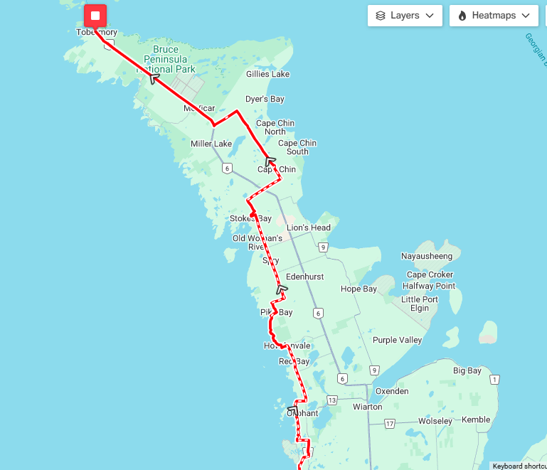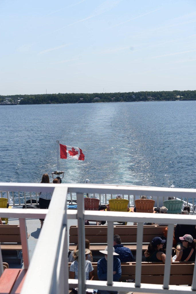 The ride is small side roads for a bit longer but then I’m on Hwy 6. It’s unavoidable at some point unfortunately. It isn’t terrible to ride on because it has a wide, clean shoulder, and it is really smooth so I can make good time on it as well. I take my first break after lunch at a little rest area and decide to check the ferry schedule again because I’ll probably get to Tobermory well before 3. That’s when I see that I misread the schedule and the only ferry before 5pm is at 1pm. Taking the 5pm ferry wouldn’t be a big deal but it would mean I’d get to the campground just before it got dark so taking an earlier ferry would mean I could be a bit more relaxed about things but I’m not sure that I can make it to Tobermory by 1pm. Only one way to find out! I push myself and make it into town, but now I need to get to the ferry terminal. I’ve taken a boat tour before so I go there but that’s not the ferry. I ask one of the employees and they point me in the right direction. Thankfully there still in the process of loading the cars so I’m able to buy a ticket and get on as pretty much the last person, they end up turning some cars away that come after me.