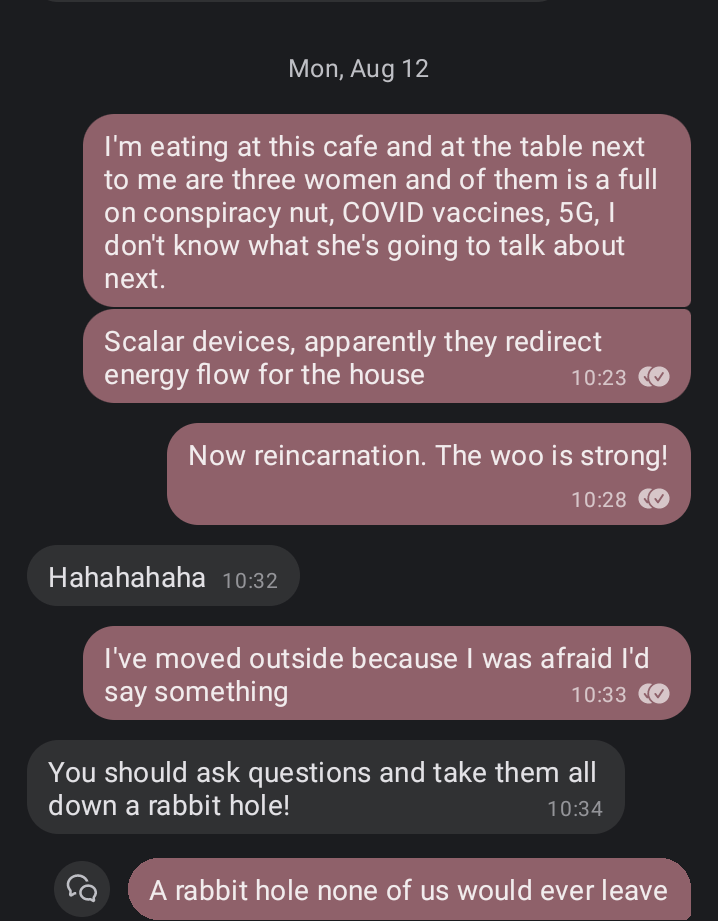 The conditions are really good for riding, the roads aren’t too rough, it’s warm but not too hot, no hills, and there isn’t a headwind. I make better time than expected and hit my lunch spot early, just a bit after 10am, but I’m still able to order a sandwich. The kid working the cash register is wearing a volleyball shirt and part of me wants to say that my daughter plays volleyball too but I know my kids don’t really like talking to adults they don’t know so figure I should just keep my mouth shut. As I’m eating my lunch I can’t help but pick up on this conversation happening at the table next to me.