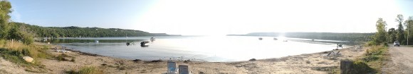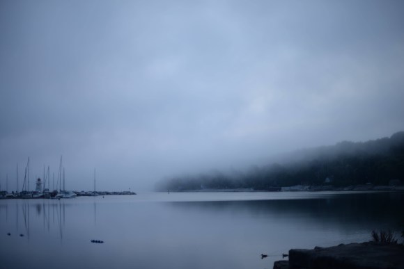 When I get out of my tent I can barely see anything because the whole area is covered in a dense fog so it was probably a good idea to do without that emergency blanket. It isn’t too cold and once I start riding I warm up quickly. Riding early in the morning on quiet roads is nice because the world is silent and I don’t need to worry about cars, not that there’s a lot of car traffic out here anyway. I make it to Hope Bay, which is another pictaresque bay, and see the general store but it isn’t open. It looks like it’s the store for a resort/campground and while the sign on the door says it should be open it looks like whoever is supposed to be running it is doing something else. I wait around on the beach for a while hoping someone will show up and have another granola bar. It looks like I’m not going to be able to get anything until I make it to Wiarton another 35km away.