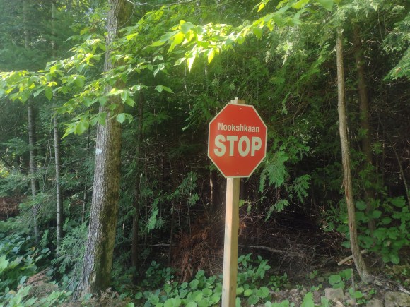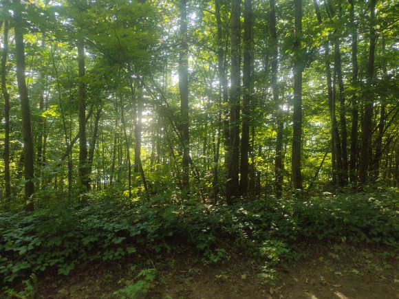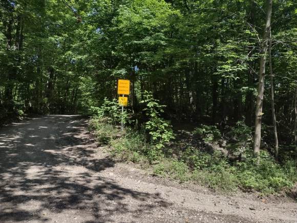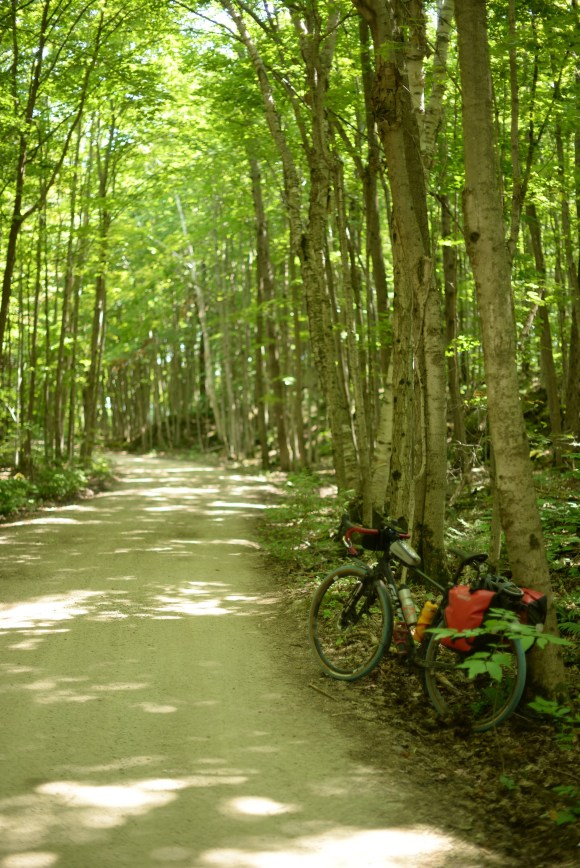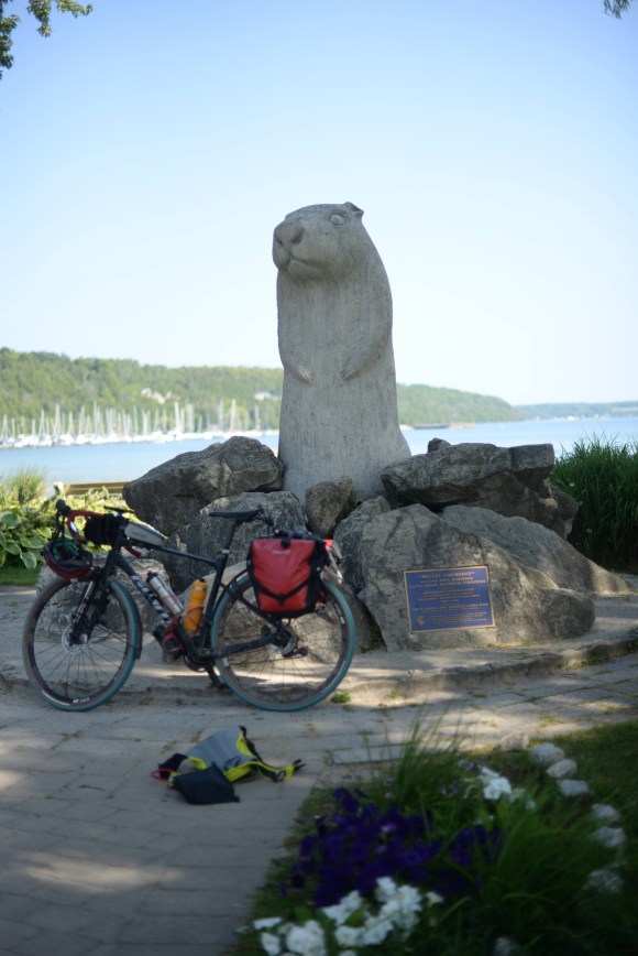 Wiarton is a proper town and by this time everything is open. I stop at a coffee shop and get a coffee and chocolate croissant. At one level I can appreciate that both the coffee and croissant are better quality than the coffee and chocolate eclair I had at the Markdate Tim Horton’s but on another level that quality is wasted on me in my present state and I just want the carbs and caffeine. I still take my time with it because I’m ahead of schedule thanks to not stopping off for breakfast earlier. Because I’m in Wiarton I have to visit the statue of Willie and after that I go to Foodland to stock up. When I finish my shopping some other cyclists stop to pick up something, one of them goes in to shop and the other watches over the bikes. They’re roadies on expensive looking bikes. One of them warns me about the main roads, especially Highway 26 as there are a lot of trucks on it. I told them that I’m mostly riding on smaller gravel roads but thanked them for the advice and went on my way. Sure enough I leave Wiarton and am back on quiet gravel roads. At some point my route merges onto the Bruce Trail and I’m riding on singletrack for a short section! It was fun but on a gravel bike with loaded panniers it was pretty rough so I’m glad it was just for a short section.