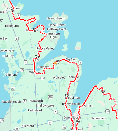 The ride to Wiarton is pretty nice. I start along Hope Bay Road, hugging the shore and passing by houses. The road dead ends with a gate that says “road closed” but that just means that there’s a rougher gravel road on the other side of the gate. A car would need to do something about that gate but a biker or walker can just go under it which is what I did. The road just goes through a forested area, there aren’t any houses or other streets so it’s pretty desolate although there were a few people walking along it, maybe they were camping somewhere nearby. Eventually I start to see campsites so I guess I’m in some campground or park. It turns out this is Cape Croker Park which looks like a nice campground to stay at if you’re going to the Bruce Peninsula. One for the future. After that it’s more gravel roads until I get back to Highway 6 for the descent into Wiarton.