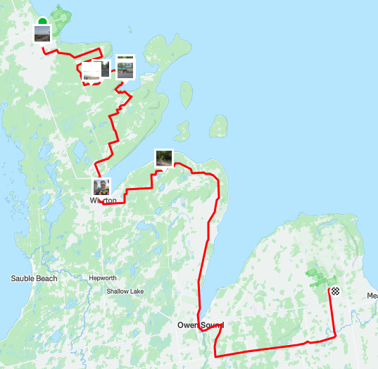 One advantage of doing a bikepacking trip over a hiking one is that you don’t need to be as self-sufficient because depending on your route you may be passing by multiple towns or at least points to get some water and food. That being said it’s always a good idea to have supplies on hand because life in unpredictable and shops and restaurants might be closed, your route or schedule might change, or there could be some other issue that might mean you won’t be able to replenish supplies as planned. In my case because the Foodland was closed by the time I got to Lion’s Head it meant that I’d be eating granola bars and water until I came by an open store. My first chance would be in Hope Bay about 25km away. According to Google Maps there’s a general store there so with any luck I’d be able to pick up a muffin or cookies and something to drink.